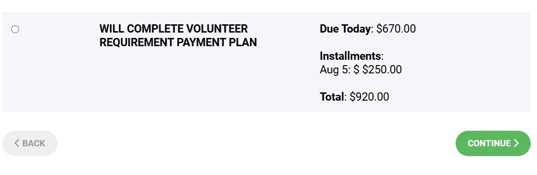 - The $250 volunteer buyout will not be charged until August 5th. When your volunteer requirements have been completed that payment will be cancelled.
